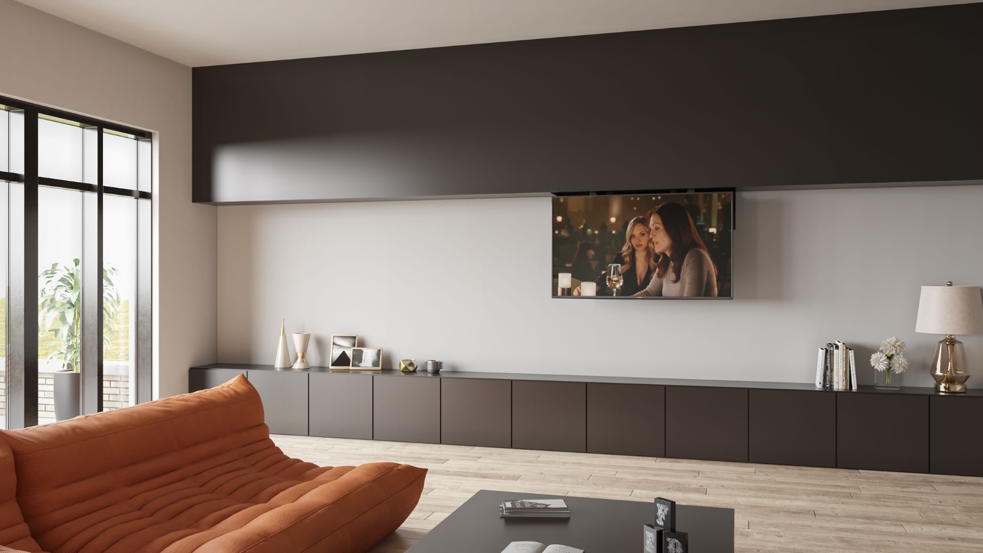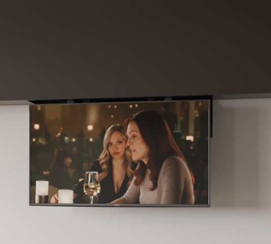 Μηχανισμός κάθετης μετακίνησης επίπεδης οθόνης, μέσα από ψευδότοιχο, ψευδοροφή ή έπιπλο.