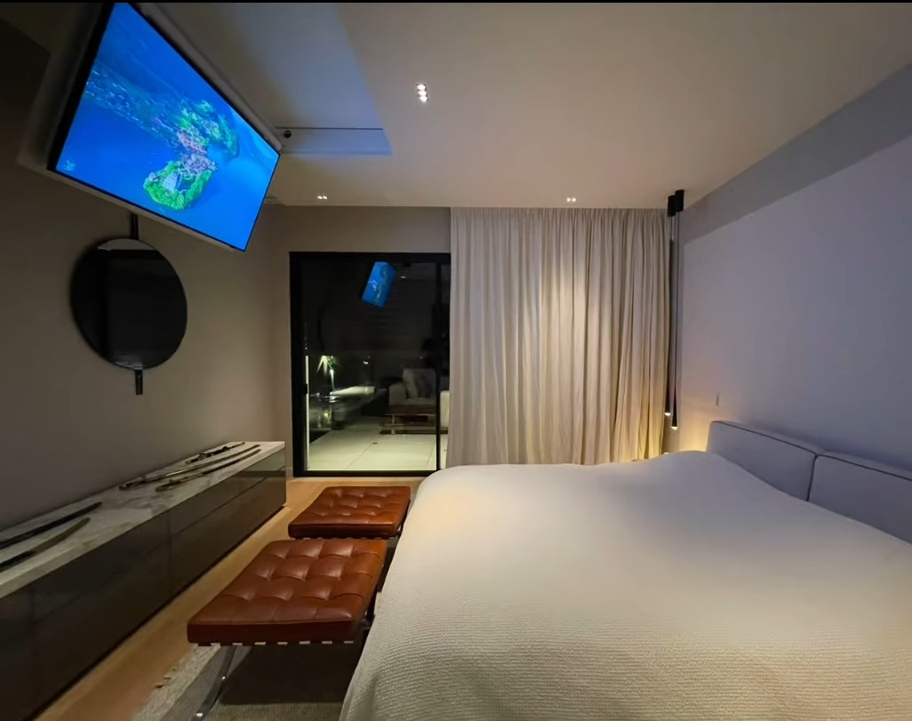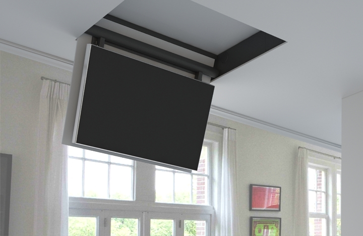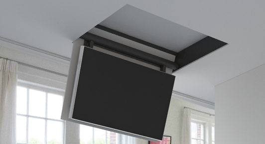 FPLCV2-85 model of TV ceiling lift mechanisms for extra large TV sizes, suitable for TVs ~85” . Elegant and silent, this heavy duty series of TV lifts provides safety and utility, while concealing large TV sets inside ceiling structure. FPLC V2 TV lift series with simple swiveling at 100 degrees from ceiling and minimum ceiling depth required at  220mm, is also equipped with safety locking system in closed position.